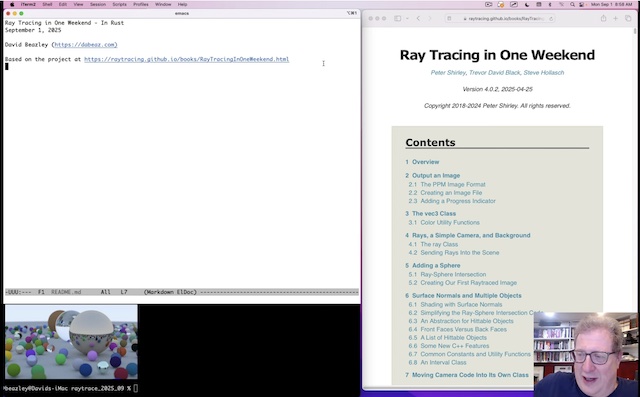 In this seven hour video series, presented without commerical interruption, I work through Peter Shirley's Ray Tracing in One Weekend tutorial in Rust. If you're new to Rust, this might give you a nice taste for the basics of the language. The video captures every keystroke without edits--perfect if you want to work along with the project yourself.